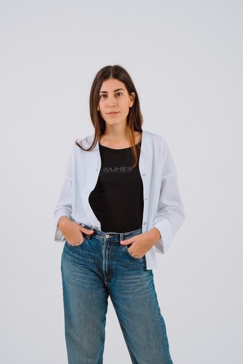 Blusa con escote de pico y manga larga acabada en puño. Bajo simétrico. Detalle NUHES bordado en el puño de la manga derecha. Cierre frontal con botones.