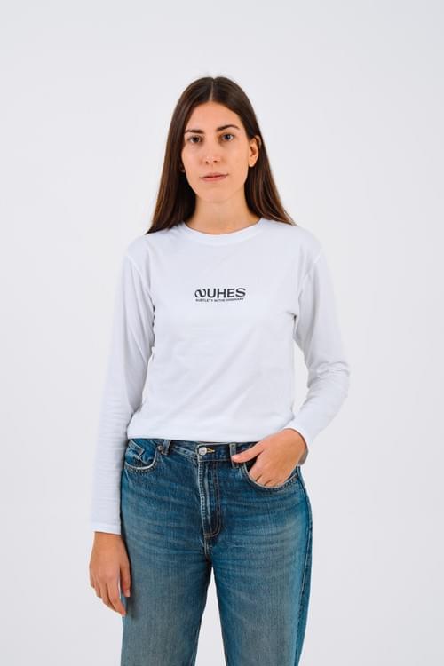 Camiseta de cuello redondo y manga larga. Bajo recto. Detalle NUHES estampado en la parte frontal.