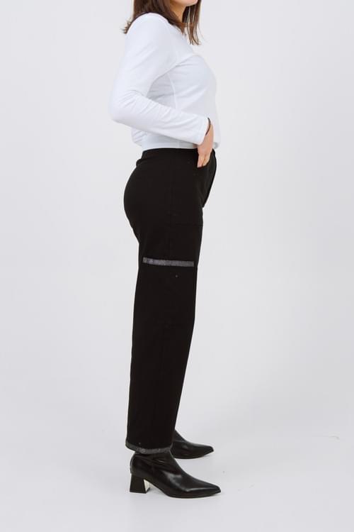 Tiro alto. Dos bolsillos delanteros, bolsillo lateral y bolsillo trasero. Detalle NUHES bordado en el bolsillo delantero derecho. Tira brillante en el bolsillo lateral. Tiras brillantes ala alturadel tobillo. Camal recto. Cierre frontal con cremallera y botón.